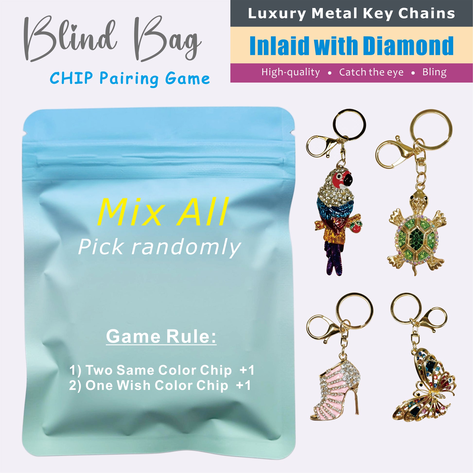 Every blind bag contains a Bling Metal Key Chain with Diamond Encrusted Pendant and there is a Color Chip in MOST of the bags.